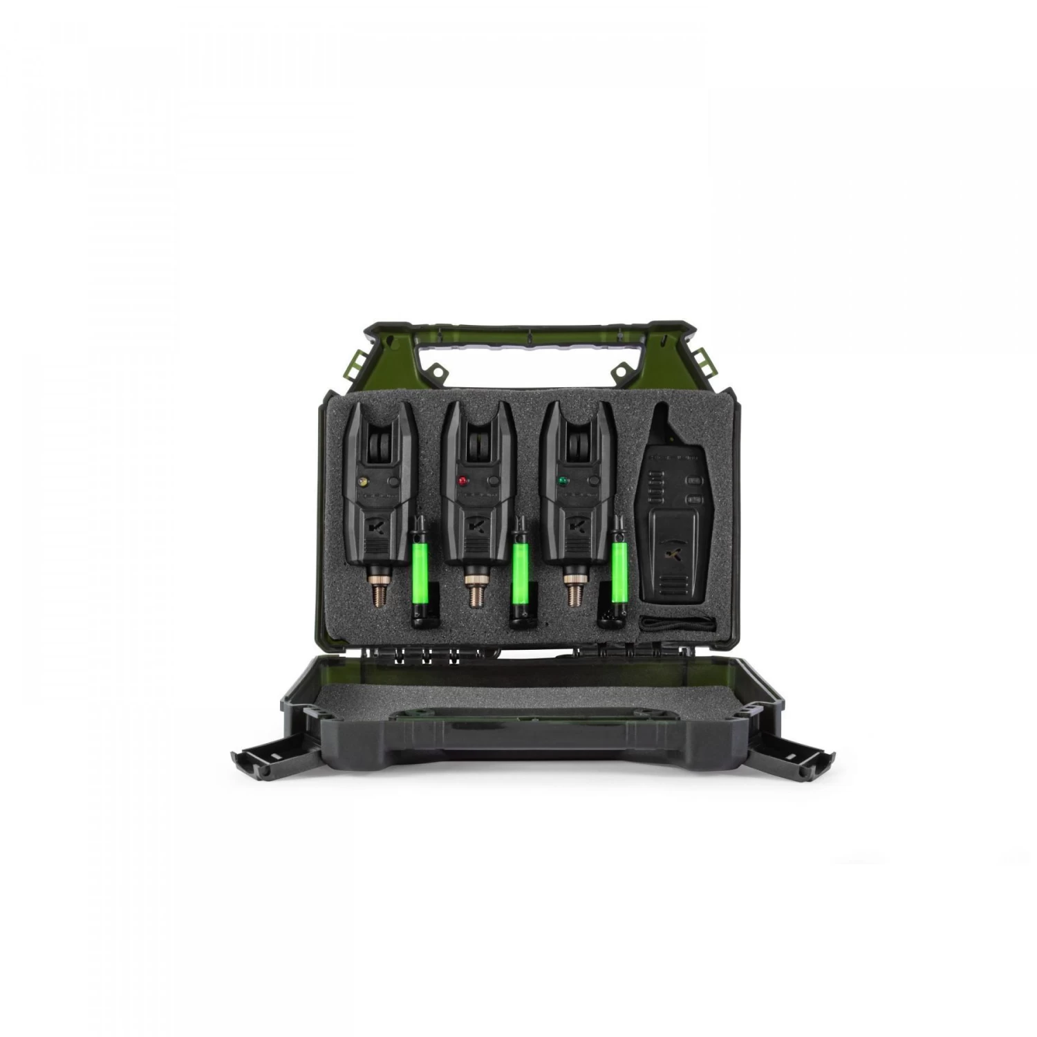This alarm presentation set contains three alarms and a wireless bite alarm receiver, as well as three bright green bite indicators. KBI alarms are compact, rugged and reliable. Featuring a sensitive roller wheel and LED light, it is a fantastic choice for all forms of sample angling. The loudspeaker has an adjustable volume, while the LED has a 10-second alert function. The receiver has a long wireless range, on/off switch and volume control. Used in conjunction with the alarm heads, this high quality combination will not let you down. FEATURES:Includes 3 bright green eye indicators, Adjustable volume, Vibrating function on receiver, 5mm LED, Compact design, 10 second lockable LED, Adjustable lock nut and compression washer, Water protected speaker, High performance speaker, Sensitive key indicator, Battery powered one 9V battery (not included), Receiver powered 3 AAA batteries (not included).